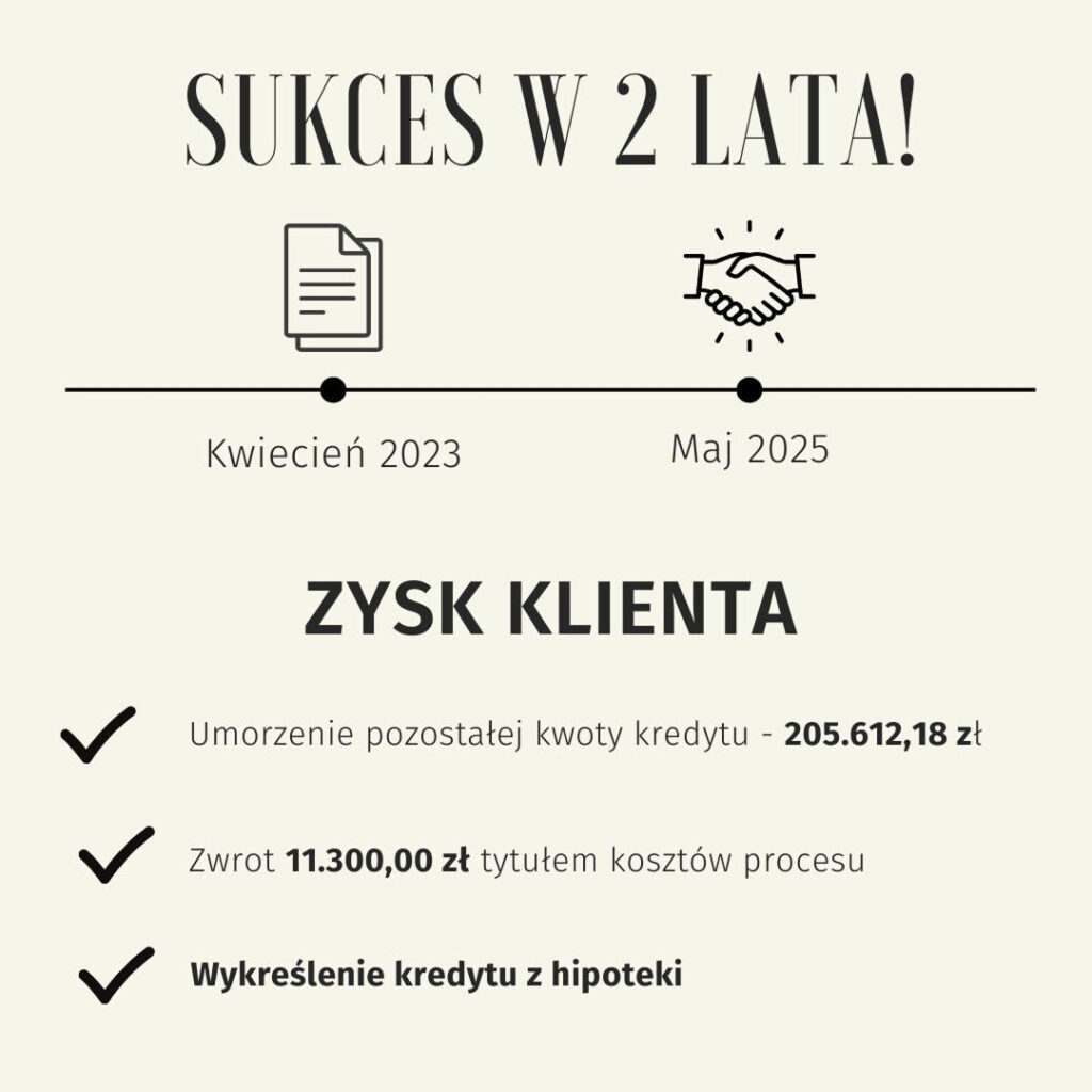W 2005 r. zaciągnąłeś kredyt w CHF o równowartości 300.000,00 zł. W 2021 r. spłaciłeś kredyt w całości, uiszczając łącznie na rzecz Banku kwotę 400.000,00 zł. Obecnie zastanawiasz się, czy pomimo spłacenia kredytu nadal możesz pozwać Bank o zwrot uiszczonych przez Ciebie środków? Odpowiedź brzmi: tak! Nawet jeśli spłaciłeś już swój kredyt w CHF, nadal możesz odzyskać od Banku wpłacone środki z uwagi na nieważność Twojej umowy. W takim przypadku sformułowalibyśmy w Twoim imieniu jedno roszczenie o zapłatą od Banku na Twoją rzecz kwoty 400.000,00 zł wraz z ustawowymi odsetkami. W przypadku wygranej w Sądzie otrzymasz od Banku 100.000,00 zł wraz z ustawowymi odsetkami.